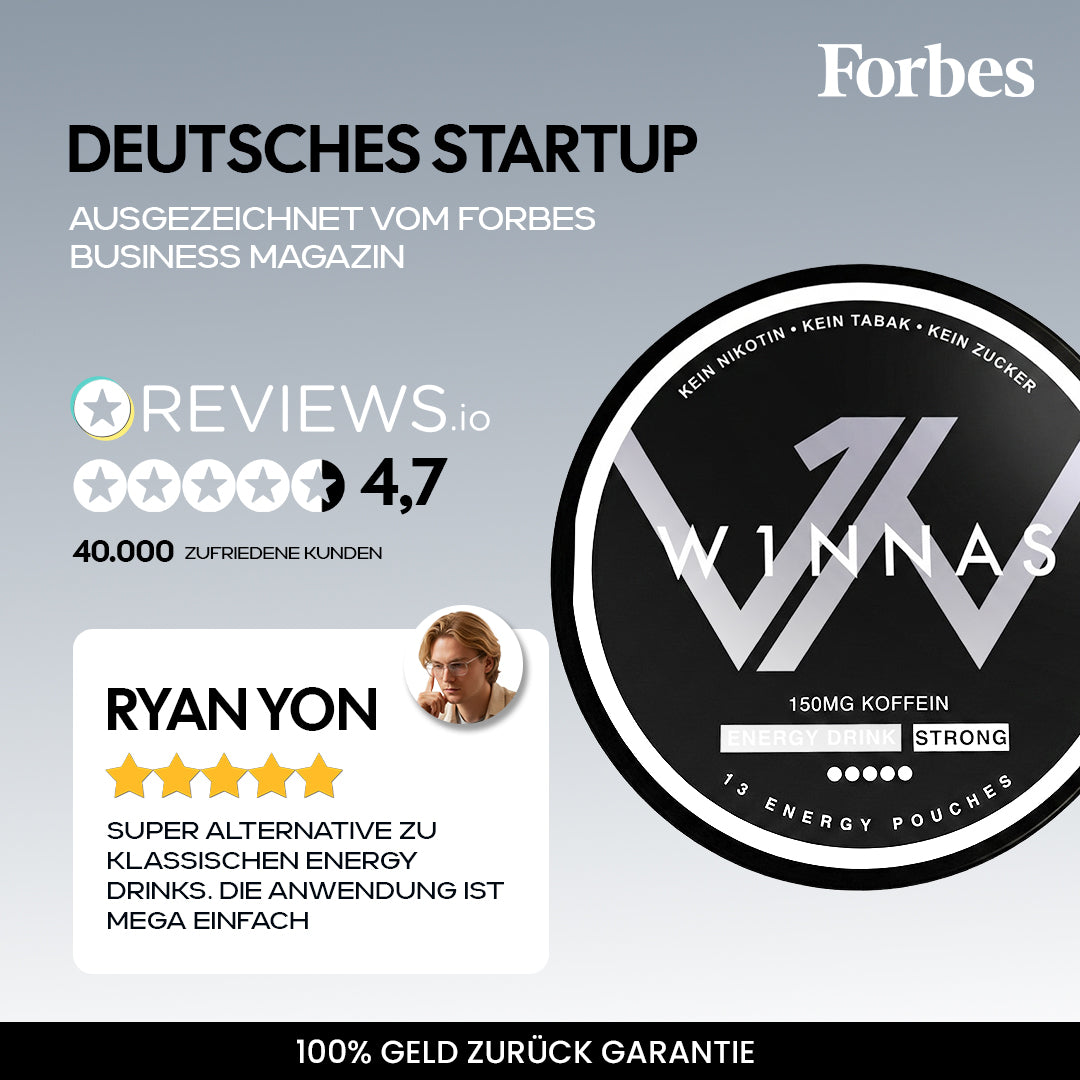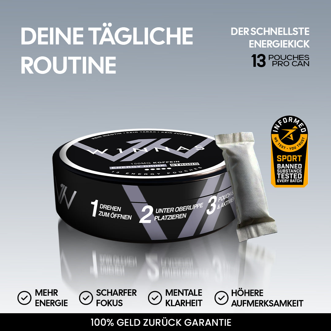 W1NNAS Performance Pouches sind ein Durchbruch bei der Leistungssteigerung von Sportlern und bieten eine nikotin- und tabakfreie Ergänzung und sind ein Nahrungsergänzungsmittel. Sie wurden entwickelt, um Leistungsdefizite schnell zu überwinden und ein hohes Maß an Energie und Konzentration während sportlicher Aktivitäten zu erhalten.