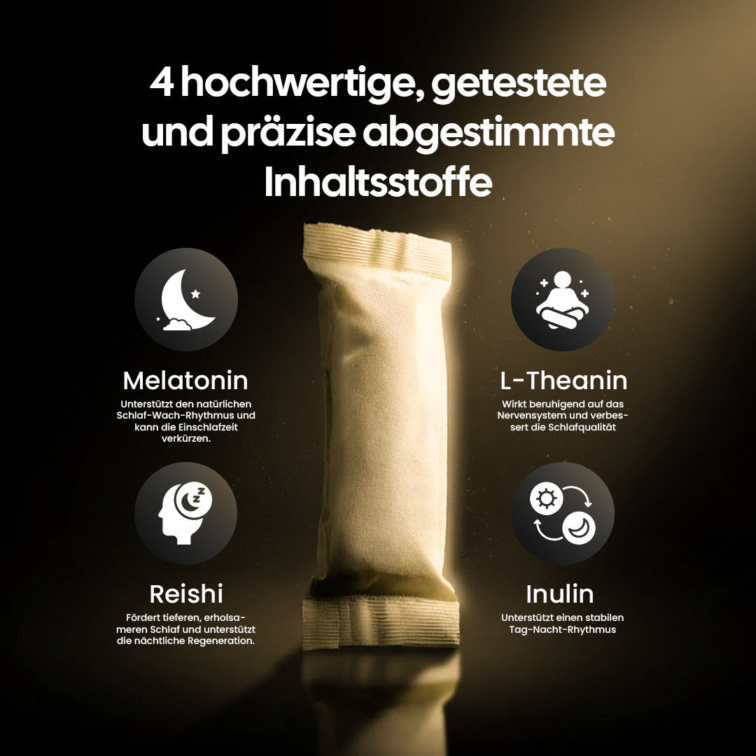 Das Sleep Pouch enthält Melatonin, Reishi, L-Theanin und Inulin, um deinen Körper innerhalb von 15 Minuten runterzufahren und deine Einschlafzeit zu verringern und deine Schlafqualität zu verbessern.