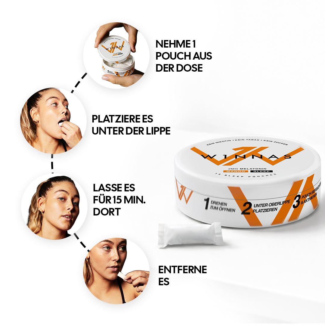 Nimm ein Pouch 15 Minuten vor dem Schlafengehen oder vor der Performance.